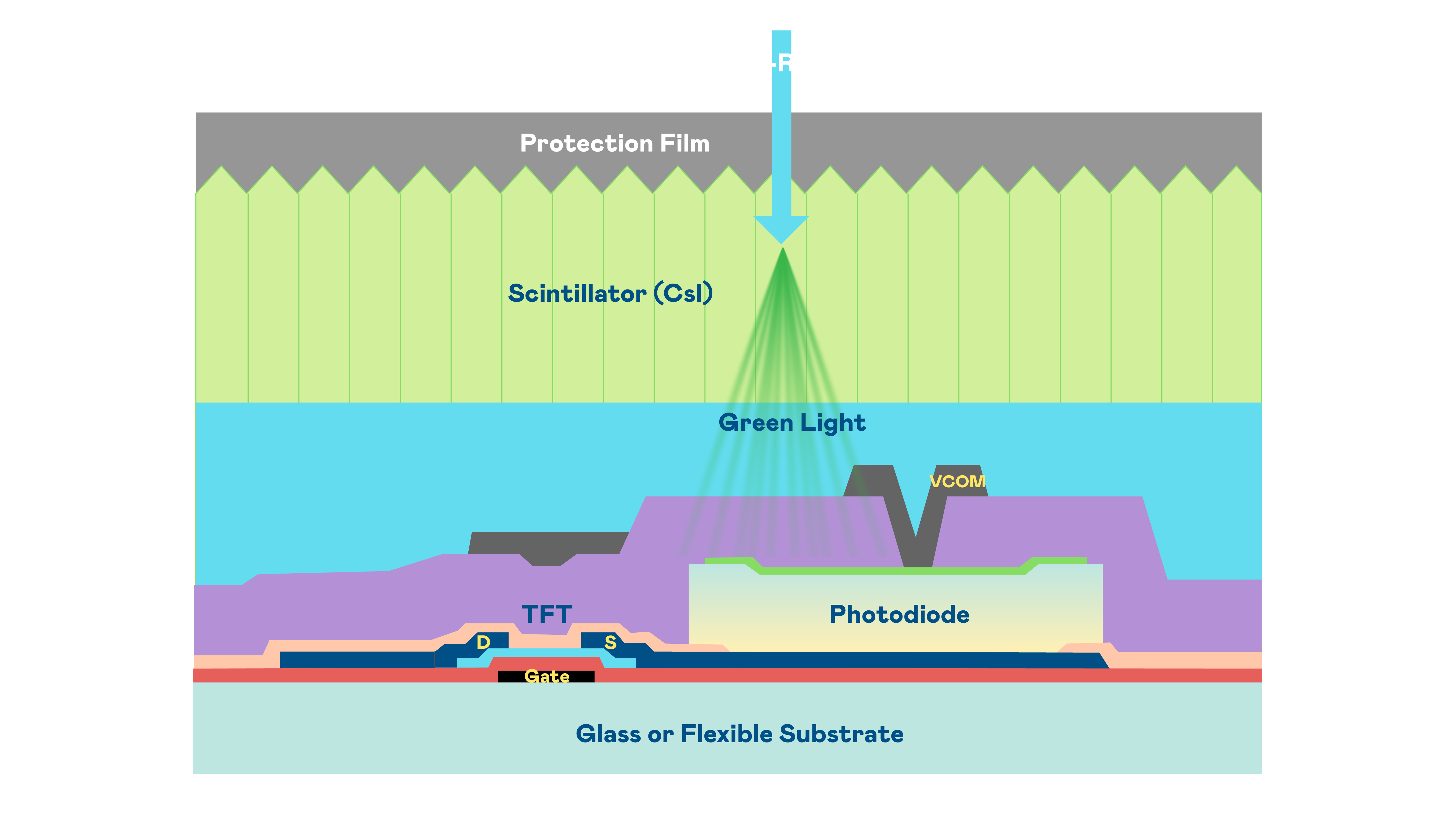 AG棋牌的X光影像感测阵列使用薄膜电晶体 (TFT) 作为每个像素的读取开关,搭配光电二极体(Photodiode)的光电转换元件,用以感测X光影像讯号。